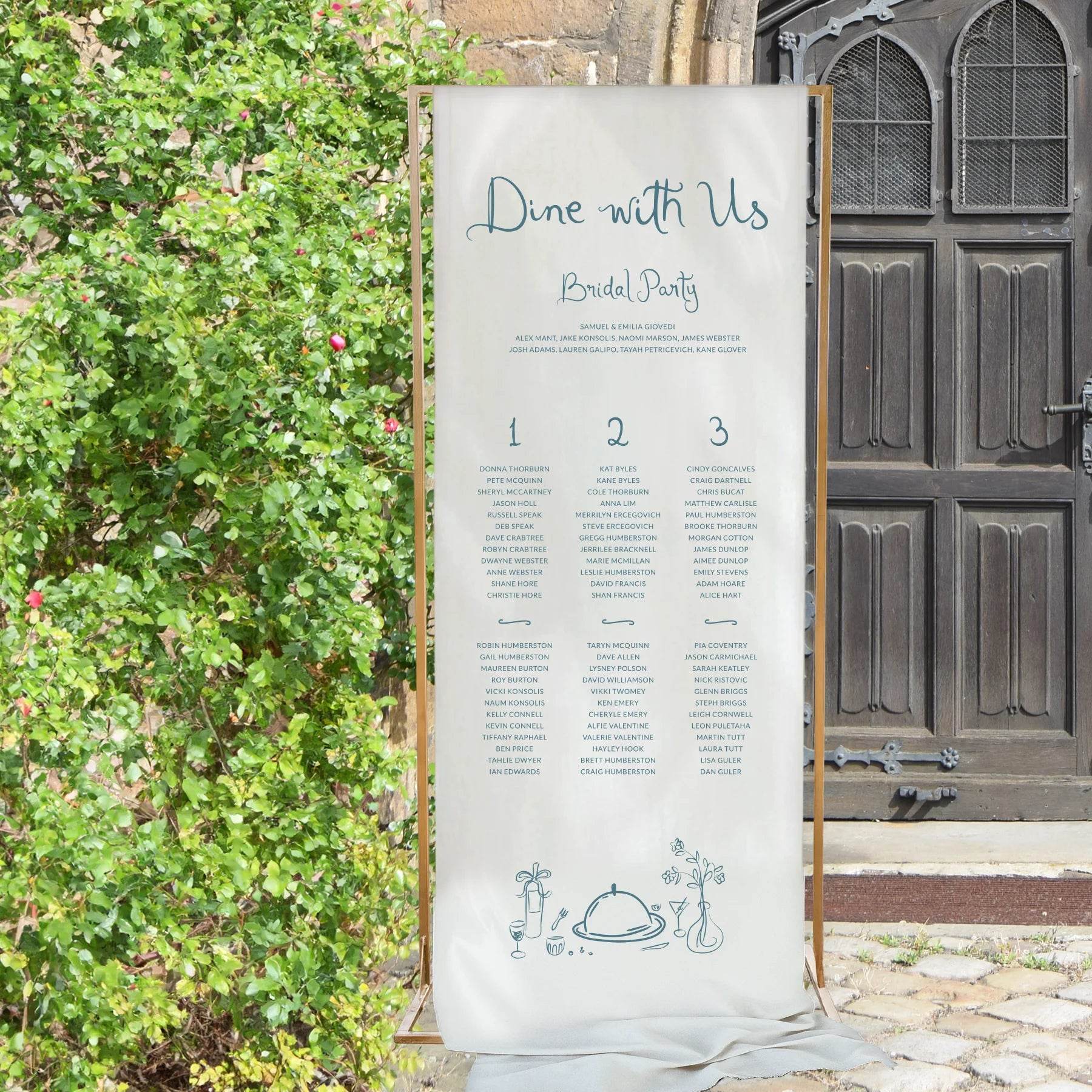 - Eco-Friendly Fabric Signage: Made from a linen/cotton blend, our fabric signs are printed with water-based inks, featuring a raw edge for a timeless, natural appeal. This fabric seating chart option is both stylish and sustainable, ideal for couples who value eco-friendly choices.