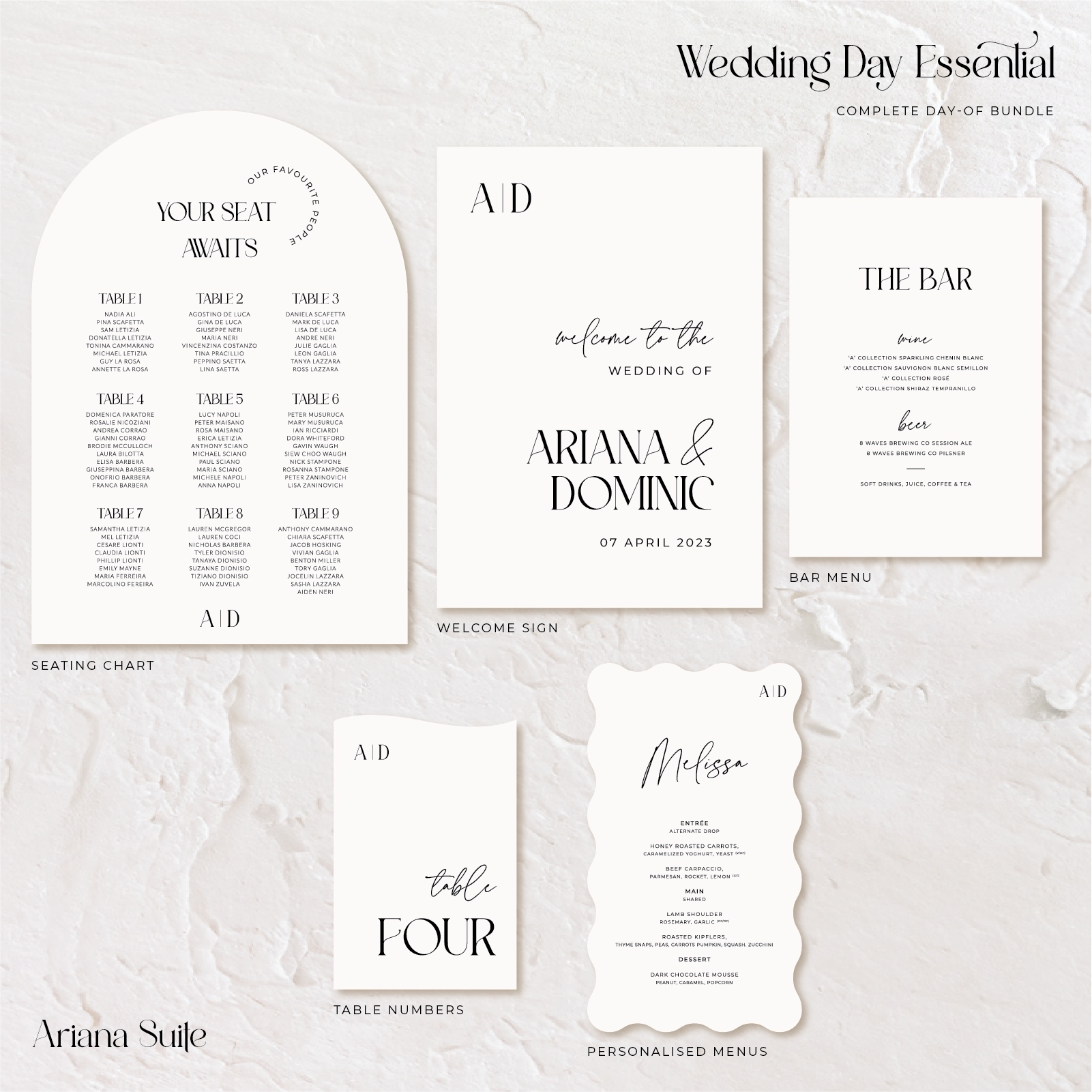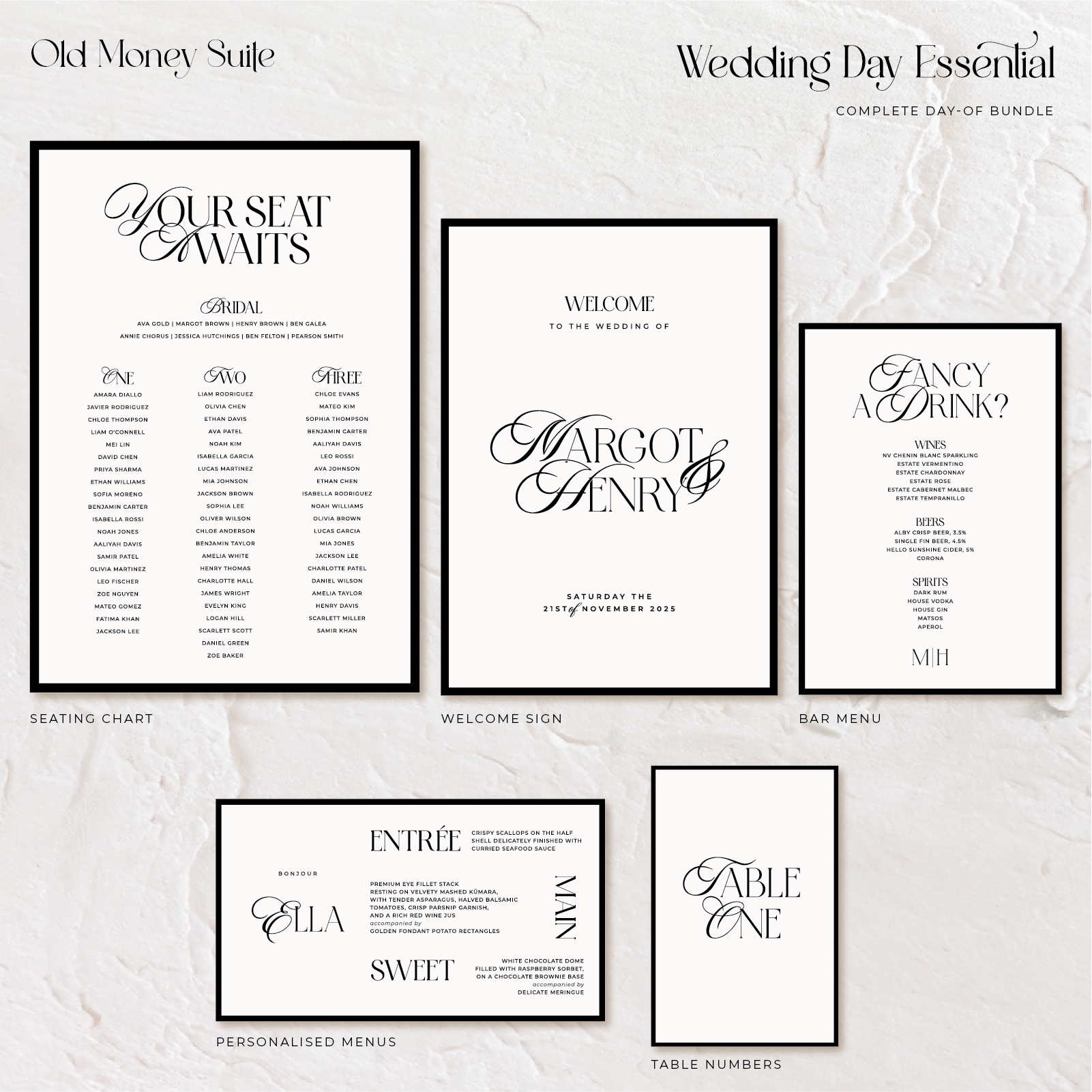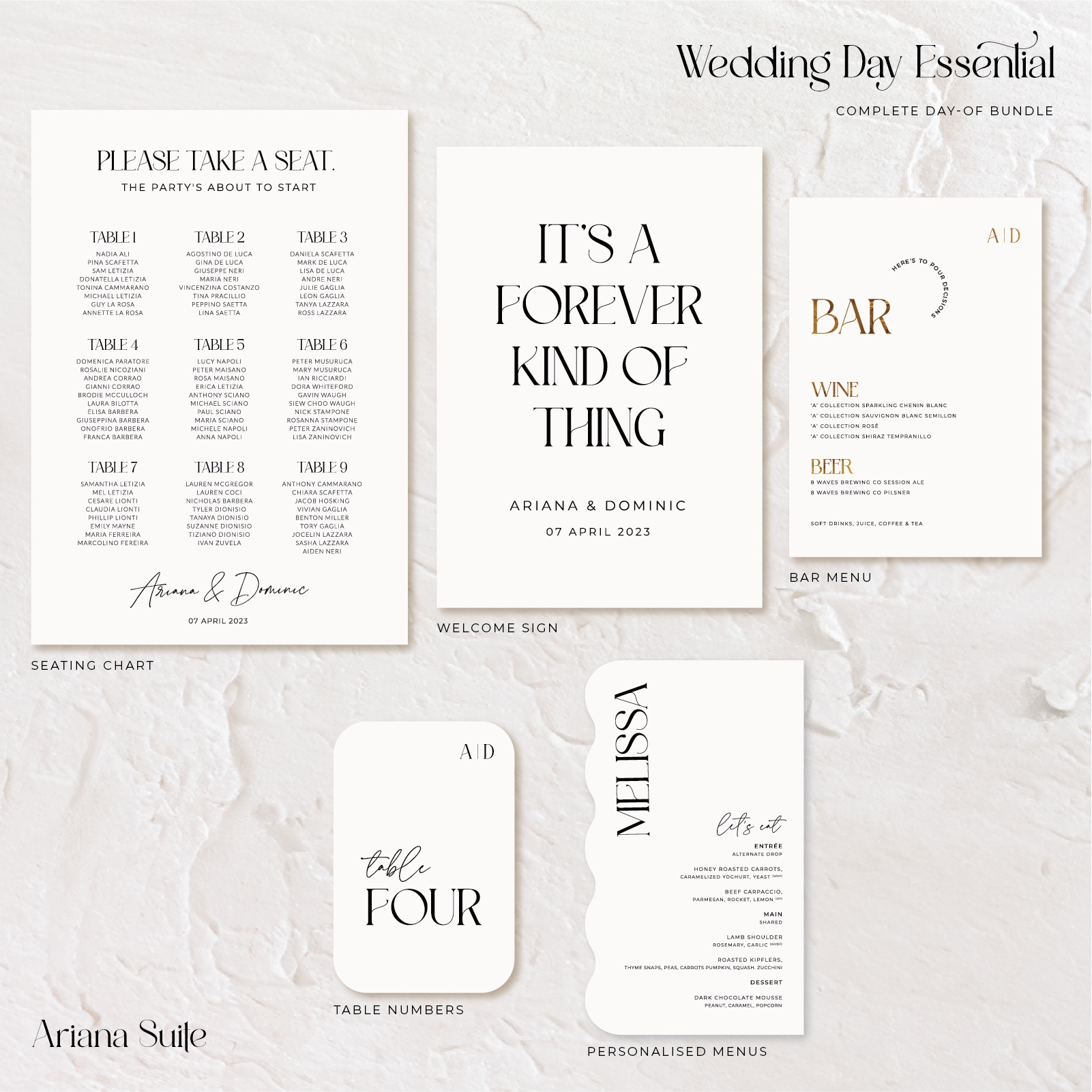 Everything you need, perfectly matched—welcome, seating, bar, menus, and table numbers. Designed, proofed, and delivered ready to display.